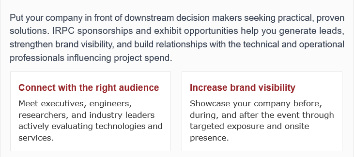 The International Refining and Petrochemical Conference (IRPC) is where the world’s leading operators tackle the toughest technical challenges. From Aramco, BASF, Chevron, Dow, ExxonMobil, Hindustan Petroleum, Indian Oil, Reliance Industries, SABIC, Shell, to Sinopec—just a sample of the global operating companies that send their experts to IRPC.